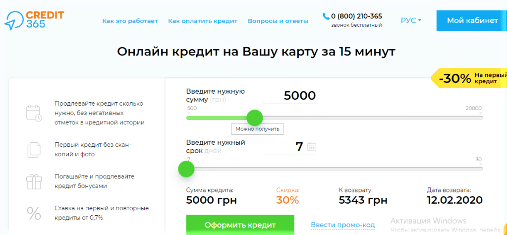 CREDIT 365. 15 минут на рассмотрение заявки. Денежные средства перечисляются на карту. Требования: возраст от 18 лет, паспорт гражданина Украины, номер карты, отсутствие просрочек по кредитам. Сумма кредита для новых клиентов: до 5000 грн. Ставка от 0,7 %. Срок погашения: до 30 дней.