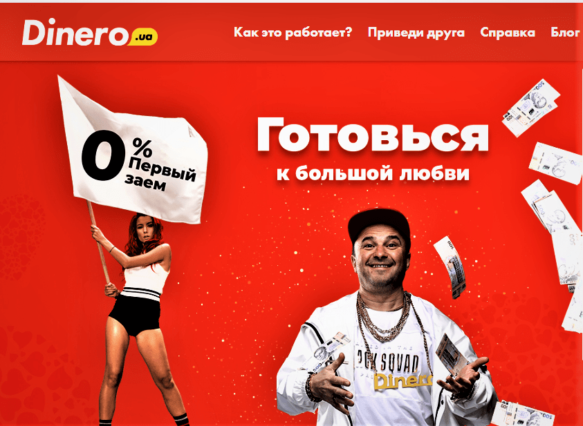 - Dinero — быстрые кредиты населению в соответствии с законодательством. Срок рассмотрения заявки: 15 мин. Способ получения — перевод на банковскую карту. Требования к заемщику: возраст старше 18, наличие паспорта, карты, отсутствие задолженности по кредитам. МФО работает в режиме 24/7. Ставка для новичков — до 10 тыс. грн. под 0% на период до 30 дней. Следующий заем в размере до 23 тыс. грн. при условии погашения предыдущего кредита. Действующие акции: