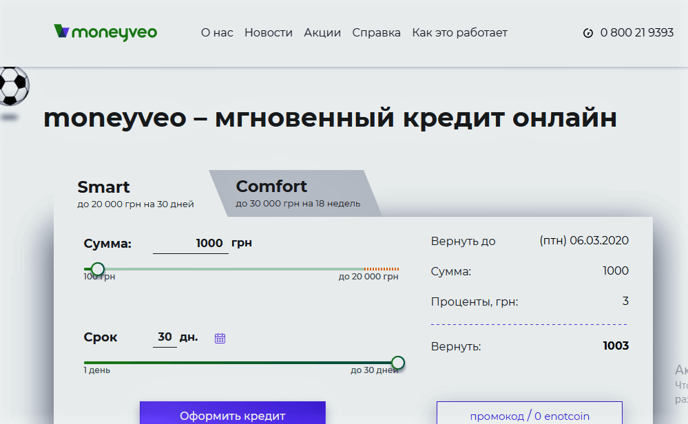 Moneyveo. Мгновенный ответ на заявку: 8 минут. Система функционирует в режиме 24/7. Деньги выводятся на банковскую карту. От заемщика требуется: номер карты, телефона, электронная почта, возраст от 18 лет. Сумма первого займа до 5 тыс. грн. Срок: до 30 дней. Действует программа лояльности.